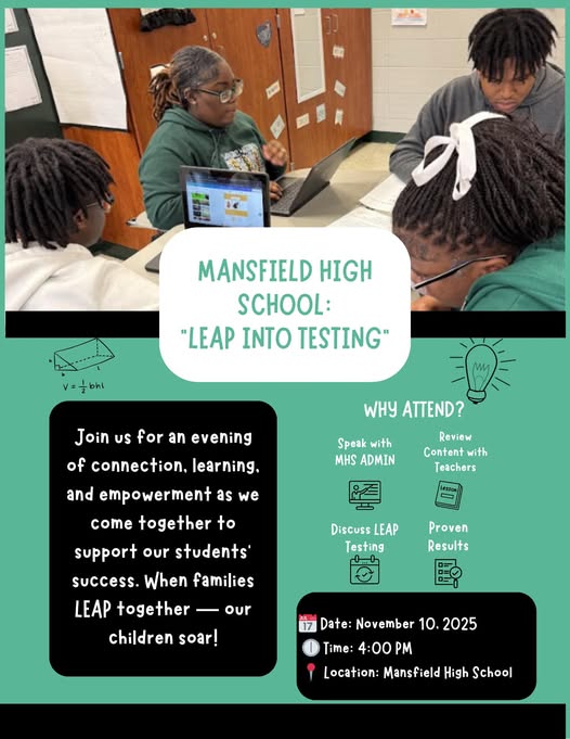 Monday · 4:00 PM · MHS Library Parents and students—come get the breakdown of the LEAP 2025 assessment, expectations, and how we prepare our Wolverines for success. ✅ Freshman snacks & refreshments will be available. ✅ Real conversations about academic success.