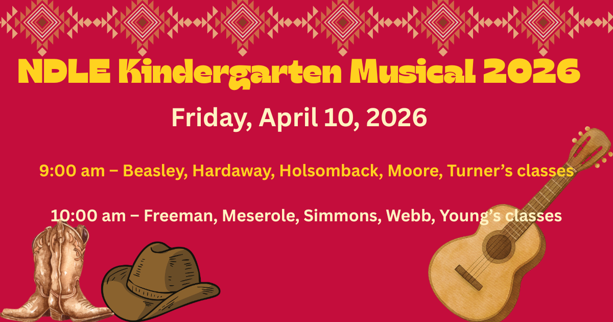 Dust off your boots and get ready for a morning of music and smiles! Our talented Kindergarten students have been working hard to prepare a wonderful series of country and folk-themed songs to perform just for you. We can’t wait to see our little stars shine on stage! When: Friday, April 10, 2026 To ensure everyone has a great view, we have two performance times: 9:00 am Performance: Featuring the classes of Miss Beasley, Mrs. Hardaway, Mrs. Holsomback, Miss Moore, and Mrs. Turner. 10:00 am Performance: Featuring the classes of Miss Freeman, Mrs. Meserole, Mrs. Simmons, Mrs. Webb, and Miss Young.