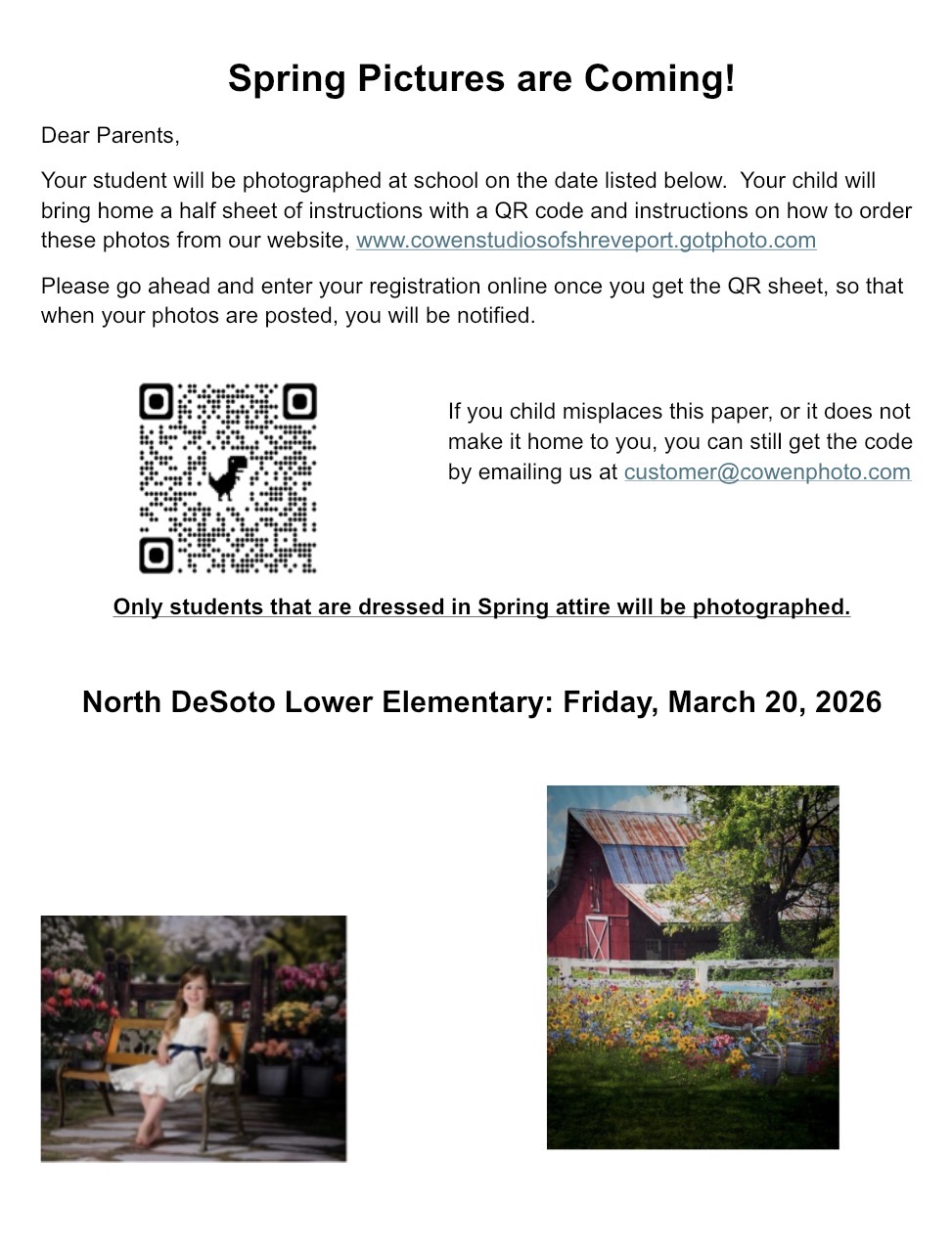 | Spring pictures are Friday, March 20. Students may wear clothing of their choice this day. |