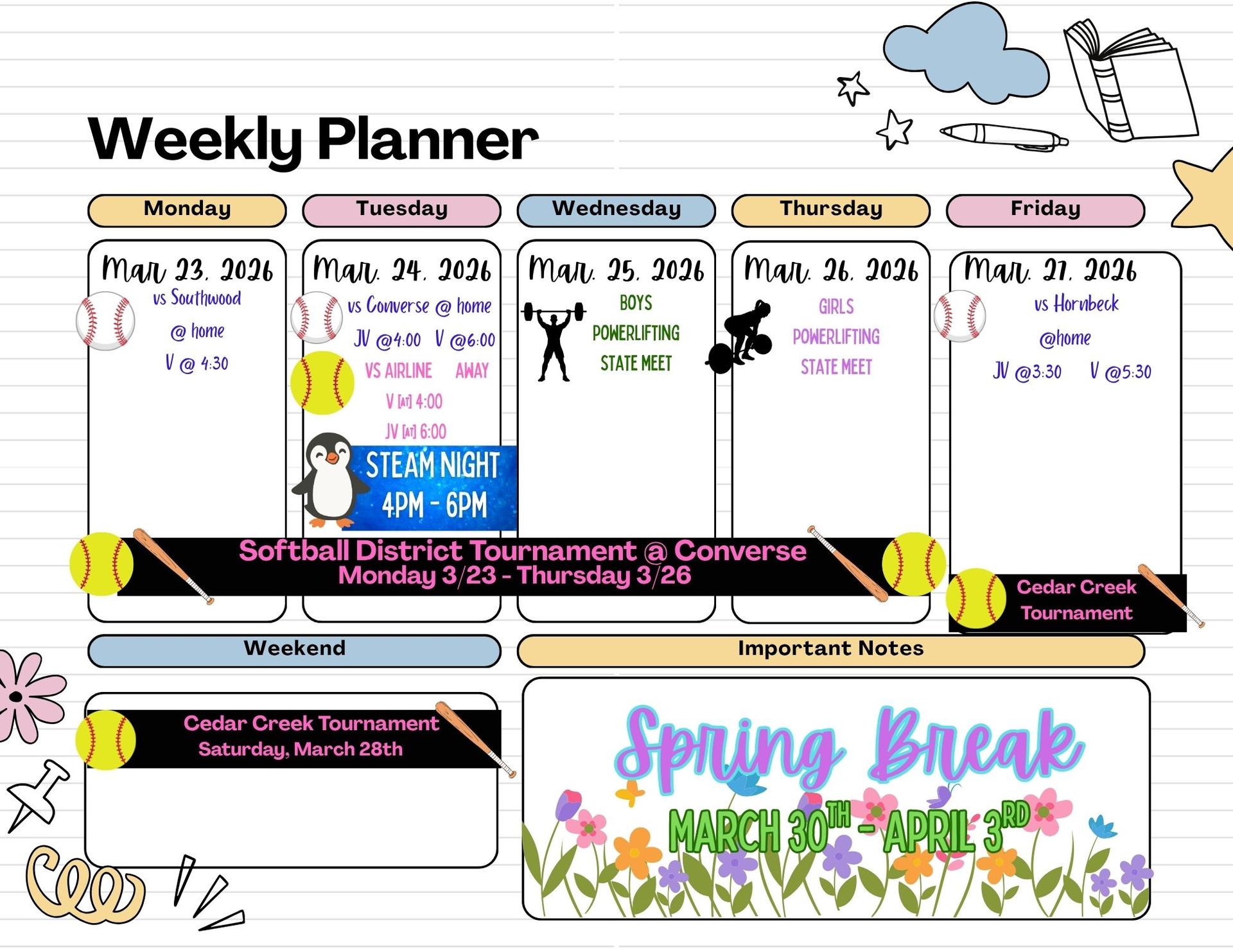 The STEAM book fair and activities will be held concurrently that night for families to shop and students to participate. We will have food trucks on site as well as our SHS Baseball vs. Converse game at 4:00 pm.
