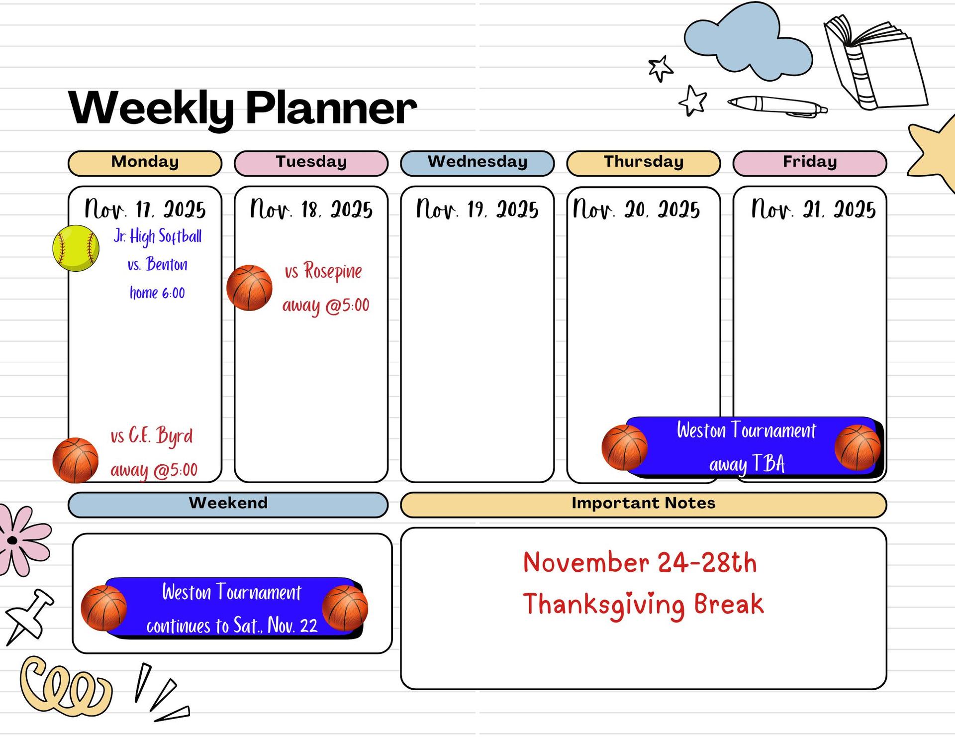 Reminder: Homecoming dress-up days are coming soon! After Thanksgiving break, the dress-up fun will kick off the following week.